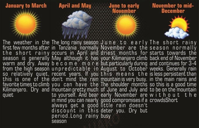 For the trekkers these are considered to be on the best times to climb the mountain Kilimanjaro in terms of weather, they are also the busiest months to many climbers. Here, we break down Kilimanjaro climbing season, off-peak alternatives and times to avoid, plus other factors to consider, so you can plan the best time to take on this mountain adventure. The rainy season starts at the end of March and continues through April to late may .